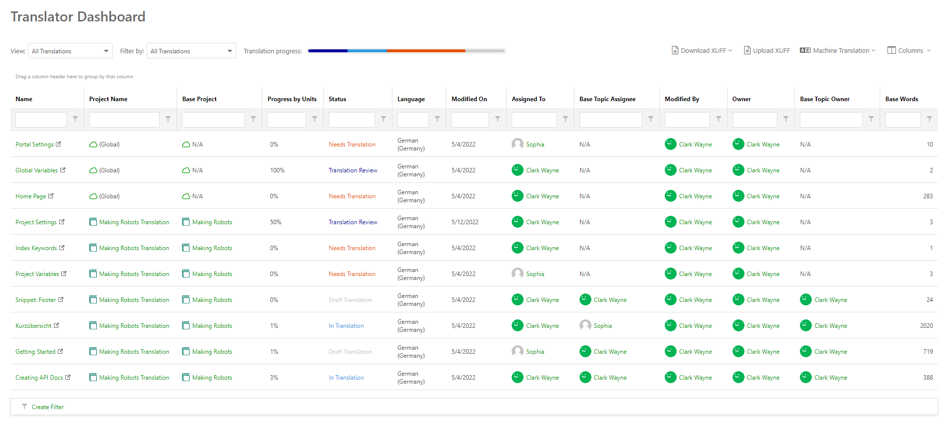 На верхней панели расположены быстрые фильтры для управления таблицей ниже, индикатор прогресса выполнения перевода, отображающий прогресс в отображаемых в данный момент документах, а также другие элементы управления: